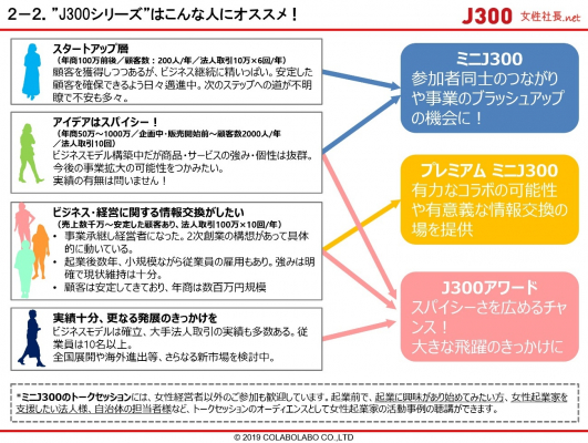 国内最大級の女性経営者データベースサイトを運営する女性社長.net((株)コラボラボ企画・運営 本社:東京都千代田区 代表取締役:横田響子)は、2019年度で11回目を迎える女性起業家の祭典「J300」にて、全国各地域でのイベント「ミニJ300」、「プレミアムミニJ300」を開催する15地域と、各地で共催運営する「J300地域アンバサダー」である女性起業家を、2019年7月25日に発表いたしました。