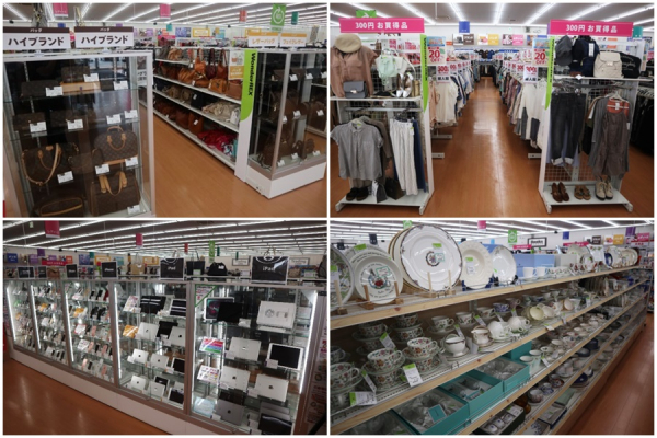 衣料品(レディース、メンズ、シューズ)、ブランド・貴金属、生活雑貨(食器、調理機器)、ホビー(ゲーム)、スポーツ・アウトドア(釣り、ゴルフ)、小型家電(オーディオ、携帯電話)など。