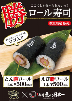 また、「とんかつ」や「海老カツ」をオリジナルロゴ入り海苔で巻いた丸かぶり寿司“バファロール”「とん勝つロール」・「えび勝つロール」を当日限りの限定コラボ商品として1本500円(税込)で販売いたします。