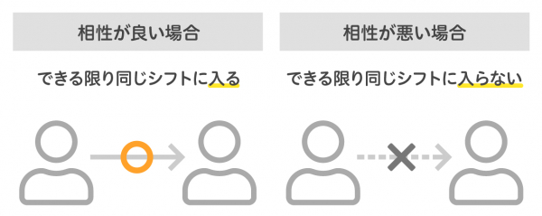 相性の良い・悪いを4段階で指定し、同じシフトに入れるようにする・できるかぎり同じシフトには入れないようにする、といった考慮をしてシフトを作成できるようになります。