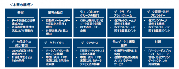 本書では、自動車データを活用し利益追求するうえで有効な戦略およびパートナシップについて概説しています。また、データ商用化を成功に導く要素や、データプライバシー及びデータアクセスに関する法規制による影響ついても検証します。
