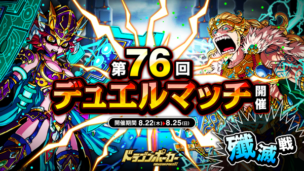 株式会社アソビズム(本社:東京都千代田区、代表取締役:大手智之)は、App Store・Google Playにて好評配信中のリアルタイム合体カードバトル『ドラゴンポーカー』で、2019年8月22日(木)より「第76回デュエルマッチ本戦」を開催いたします。