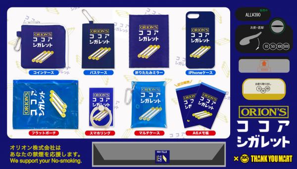 店内全品390円(税別)でおなじみの「サンキューマート」は、2019年8月23日(金)より何世代にも渡り愛され続けるシガレット型菓子オリオンの『ココアシガレット』とのコラボ商品を全国サンキューマート、WEBショップにて販売開始致します。