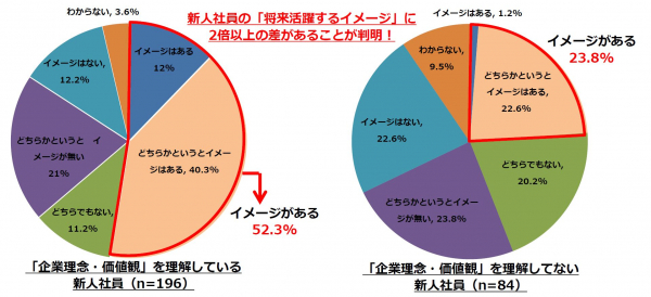 当社が実施した『新人社員の「企業理念・価値観」に対する意識調査』にて、自社の「企業理念・価値観」を理解していると回答した新人社員(196名)を対象に現在働いている会社で将来活躍しているイメージがあるかを聞いたところ「イメージはある(12.0%)」、「どちらかというとイメージはある(40.3%)」と合わせて50%以上の新人社員が活躍するイメージを持っていることが分かりました。また、同様の質問を「企業理念・価値観」を理解していないと回答した新人社員(84名)に聞いたところ「イメージはある」は僅か1.2%で「どちらかというとイメージはある(20.2%) 」と合わせても23.8%と半数以下という結果になりました。このことから新人社員が「企業理念・価値観」を理解することは、将来の活躍イメージにも影響を与えると想定されます。