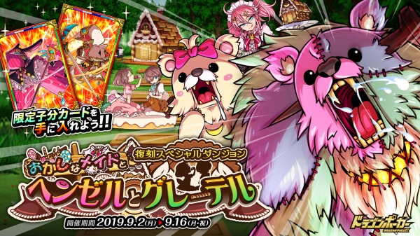 株式会社アソビズム(本社:東京都千代田区、代表取締役:大手智之)は、App Store・Google Playにて好評配信中のリアルタイム合体カードバトル『ドラゴンポーカー』で、2019年9月2日(月)より 復刻スペシャルダンジョン「おかしなメイドとヘンゼルとグレーテル」を開催いたします。