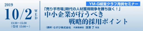 ブランド構築の理論を応用してコンサルティングとクリエイティブを行う、むすび株式会社(本社:東京都目黒区、代表:深澤 了)は、当社代表の深澤了が2019年10月2日(水)に開催される、 YM-G経営クラブ月例セミナー「中小企業が行うべき戦略的採用ポイント」に登壇いたします。
