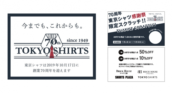 日頃の感謝を込めて10月11日(金)〜から70周年東京シャツ感謝祭 限定スクラッチ 『THANKS SCRATCH!!』イベントを行います。Thanksスクラッチの1等は、次回(11/6〜11/30まで有効)のお買い物でお好きな商品が50%引きでご購入いただけます。Thanksスクラッチの1等は、70周年にちなんで7000名様に当たります。東京シャツの各ブランド188店舗で実施予定です。