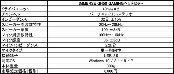 IMMERSE GH50は、高・中・低の周波数帯域で優れたオーディオ特性を持つ高品質の大口径40mmネオジウムドライバユニットを2つ搭載し、バーチャル7.1chサラウンドと重低音ブースト機能に対応したオーバーヘッドデザインのUSBヘッドセットです。着脱式のマイクを採用することにより、ゲーム以外の用途にも使用できるほか、持ち運び用のキャリーポーチも付属し、バッグの中でケーブルがほかのものにからむことも防ぐことができます。本体は堅牢な金属製フレームを採用するとともに、快適な着け心地を実現するヘッドバンド設計を採用。折り曲げやねじれに強い高品質なメッシュケーブルを採用し、ボリュームコントロールやマイクのオン・オフ、7.1chサラウンドや重低音ブーストの切り換えができるインラインコントローラーが付属しています。本製品の主な仕様は以下のとおりです。