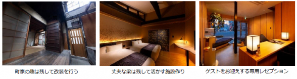 当社は多くの歴史的文化価値を持つ「京町家」を次の世代に受け継ぐべきものであると考え、外観や内観の趣や意匠をできるだけ残し、一日一組限定の一棟貸し宿泊施設として再生する取り組みを行っております。デザインや施工、運営管理、清掃まで一貫してトータルサポート出来ることが当社の強みであり、宿泊していただくゲストには京町家に泊まるという特別な体験を、そして地域社会には街の再生や活性化という形で貢献していきたいと考えています。