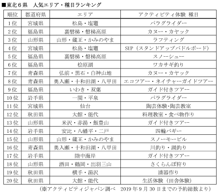 アクティビティジャパンでは、2019年9月30日までの予約数 統計データより、近年、特に訪日旅行者からの注目度が高まっている東北6県(青森県、岩手県、宮城県、秋田県、山形県、福島県)における人気エリア・種目ランキングと共に、最近の観光トレンドを注目プランとあわせてご紹介いたします。