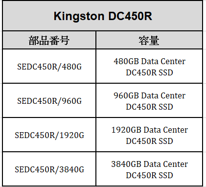 DC450Rには480GB、960GB、1.92TB、3.84TB(1)の容量が用意されています。5年間の限定保証と無料テクニカルサポートに加えて、Kingstonが誇る信頼性を備えています。詳細については、www.kingston.comをご覧ください。