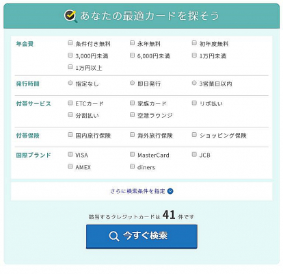 年会費・発行時間・付帯サービスなどあらゆる条件からあなたにピッタリのクレジットカードを見つけることができる便利な機能です。