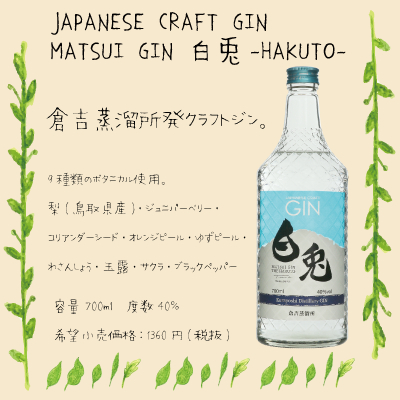 今回の対象商品となる「マツイジン白兎-HAKUTO-」は、倉吉蒸溜所発のクラフトジンで、鳥取県産の梨を中心にジュニパーベリーをはじめとした9種類のボタニカルを使用しています。ストレートはもちろんのこと、オリジナルカクテルを作ってお楽しみください。