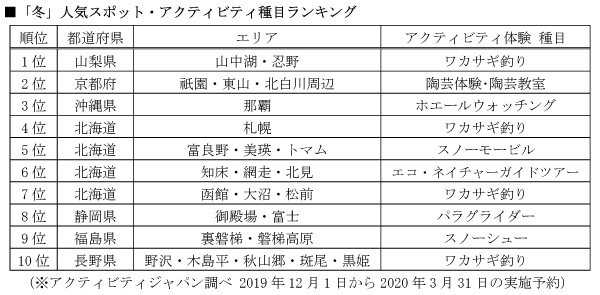 株式会社アクティビティジャパン『冬に人気のエリア・アクティビティ種目ランキング』を発表
