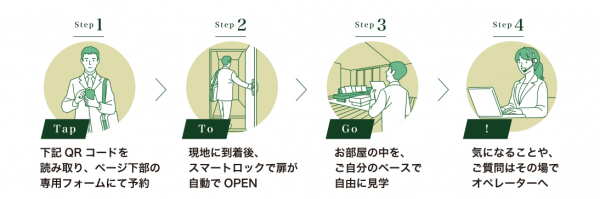 「Tap To Go!(タップトゥゴー)」は、スマートロックやスマートリモコン等のIoT機器やiPadを活用することで、モデルルームへのご来場希望者が、思い立ったらすぐにスマホひとつで来場予約することができ、案内スタッフ無しでご見学いただけます。多忙でなかなか家探しに時間が割けない共働き世帯や単身者でも、お仕事帰りにふらっと立ち寄ったり、おひとりで気兼ねなくじっくり見学することも可能です。