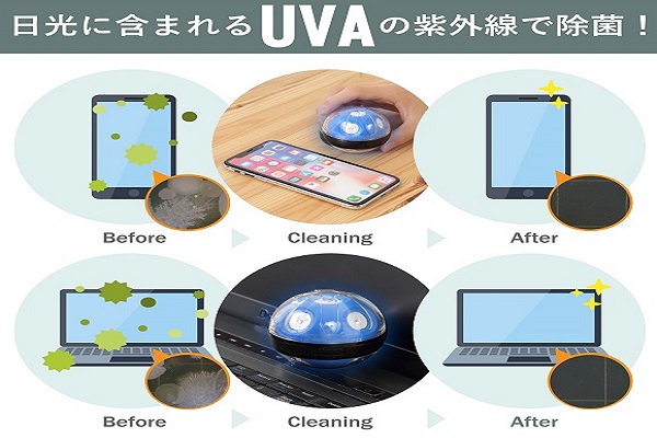地上に届く日光に含まれる紫外線によって、キーボード、マウス、スマートフォンなどの電気機器、メガネやジュエリーのようなアクセサリー、鍵、ペン、本など、今まで洗えなかった小物のバイ菌を最大99.999%以上、キレイ除去します。