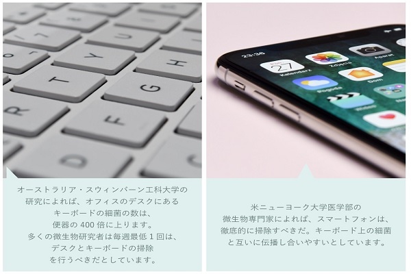 研究によれば、キーボード、マウス、スマートフォン、タブレット、歯ブラシ、カミソリ、化粧道具、調理器具など、毎日使っているような製品は、時間の経過と共に細菌の一番の温床になりやすいことが分かっています。