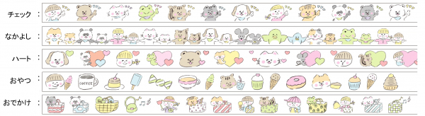 テープ幅は、10mm幅。太幅だからこそできる繊細な柄デザインで、えちがわのりゆきさんのほんわかしたタッチやニシワキタダシさんのユーモラスな動きのイラストを表現。デコレーションの幅が広がりました。