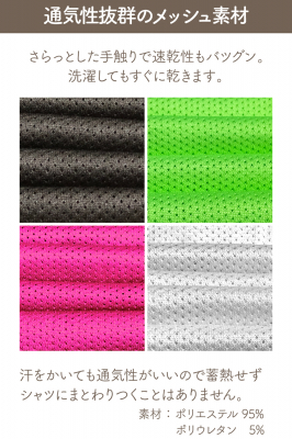 中のタグの縫製など、スポーツによる消耗を意識した設計。またストレッチ素材を混入したこだわりの素材!洗濯機で洗濯可能。メッシュ素材で、速乾性、通気性抜群のポリエステル&ポリウレタン素材。