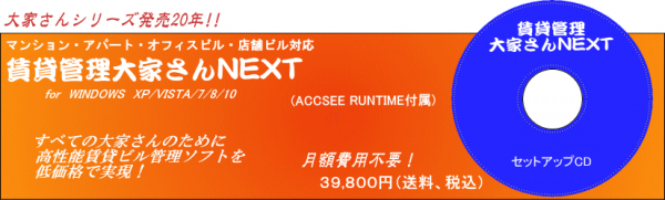 賃貸管理大家さんNEXTは、発売以来20年を超える賃貸管理大家さんシリーズの最新バージョンで、低価格でありながら、本格的な賃貸ビル管理機能を搭載したWINDOWS用ソフトです。月額費用や保守料なども不要なコストパフォーマンスに優れたスタンドアローンソフト仕様となっております。