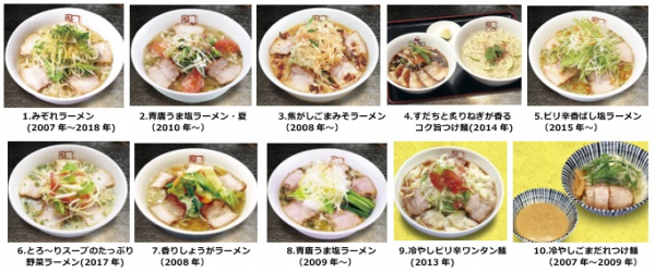「焦がしごまみそラーメン」は、焦がしたゴマの香ばしさと、店舗仕込みの“香味ラー油”が食欲をそそる担々麺風の一品で、トッピングには7種類の野菜が約150gと各店舗で手作りしている自慢のチャーシュー5枚が入った、ボリューム満点の傑作です。2003年に濃厚なゴマ味噌スープが特徴の「ごまみそラーメン」として登場し、2008年には「焦がしごまみそラーメン」として進化し、さらに2015年の改良で、ピーナッツのうま味と味を引き締める自家製香味ラー油がアクセントとして加わり、寒い時期にぴったりの味に仕上がりました。季節限定メニューの中では注文率の一番高い商品となっており、今回の投票結果でもその人気を証明しました。