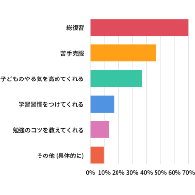 冬期講習に期待することは何か教えていただきました。「総復習」が約70%、「苦手克服」が50%弱、「子どものやる気を高めてくれる」が40%弱と回答が続きました。