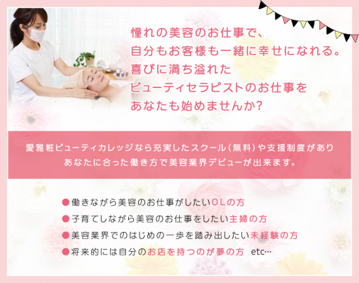 愛雅粧ビューティカレッジ大阪校(住所:大阪府大阪市西区 学院長:蓮井良子)では、これまでエステ業界に夢や憧れを持たれている方々で、費用面や時間の都合、業界に対しての不安など様々な理由で1歩前に進めなかった方に対して、ビューティセラピストの技術・資格が“受講料を無料”で取得できる「ビューティセラピストコース」の募集を開始いたします。