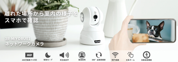 「ネットワークカメラ MIYORU01(3R-MIYORU01)」は暗視モードや双方向音声機能、動体・音声検知機能など「見たい」をサポートする充実した機能と、400万画素の鮮明な画質が特長。高性能で低コストを実現しました。