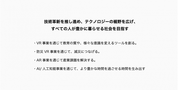 「技術革新を推し進め、テクノロジーの裾野を広げ、すべての人が豊かに暮らせる社会を目指す」、「テクノロジー開発・クリエイティブに関わる全ての人々が働きがいがある仕組みの構築」と2つの目標とそれに付帯するいくつかの目標を重点取組事項として定めつつ、最終的にはSDGsの17のゴールに向けて取り組んでまいります。