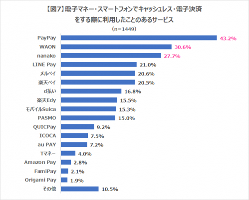 ・電子マネー・スマートフォンで利用したことのあるキャッシュレス・電子決済のサービスは、第1位が「PayPay」で43.2%