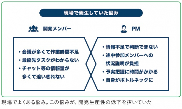 メージス.ラボでは、複数の開発プロジェクトが常に同時並行で進んでおり、プロジェクトをまたいだ人員配置やリモートワーク人員の増加によって組織が複雑化していました。そこで、各自のタスクを洗い出して進捗管理をするために複数の業務管理システムを活用していましたが、「管理品質がプロジェクトマネージャーの能力に依存する」「一部の開発メンバーに負担が集中する」「大規模な開発案件で放置タスクや抜け漏れタスクが発生する」といった課題が発生していました。