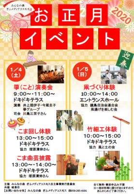 毎年恒例「ぎふメディアコスモス お正月イベント」!箏(こと)の音色やこまの曲芸できっと素敵な1年が始められます!他にもに凧づくりや竹細工作りなど、お正月行事がいっぱいです☆