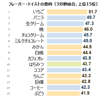 好きな風味・素材 フレーバー・テイストの2019年ランキングです。“食べたい”の総合1位は「いちご」、2位は「バニラ」という結果に。