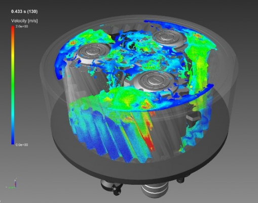 Particleworksによる遊星ギアのオイル攪拌解析結果(左)とCGレンダリング表示(右)