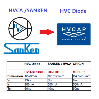 UX-C2Bは、日本のSanKenの高電圧ダイオードで、電圧8kV、電流500mAで、電子レンジの回路で広く使われています。主なブランドとしては、Panasonic、GE、シーメンス、Philips、ボッシュなどの家庭用電子レンジが該当します。以前、アメリカのHVCAも同型のモデルを製造していることに弊社は気づきましたが、現在は既にHVCA社のカタログからは除外されています。弊社HVCは、この高電圧ダイオードUX-C2Bの代替・交換可能なモデルを、競争力のある価格にてご提供いたします。