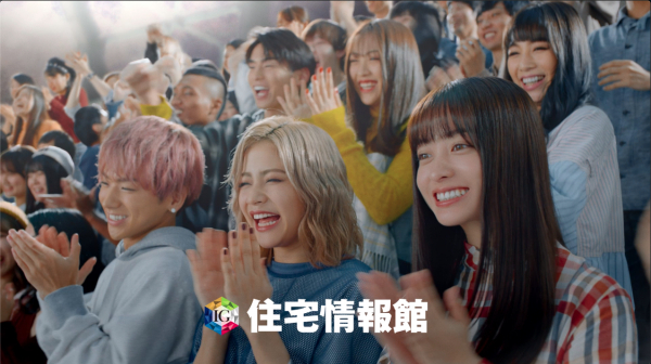 本CMの見どころは何と言ってもその迫力とスケール感。上空からのヘリコプター映像。大きなスタジアム満員の観客。観客席でワクワクしながら待つ橋本環奈さんとエルオーエルのメンバー、そして大勢のオーディエンスたち。その目の前に住宅情報館のロゴが入った大きなフラッグが広がります。歓声を上げ喜ぶ人たち。そして、声を合わせて「住宅情報館ー!」とシャウトします。出演者全員が最高潮に盛り上がり、全身から力いっぱいに声を発するシーンは迫力があります。ぜひ本編をご覧ください。住宅情報館は、今年も住まいを探す全ての皆様を応援します。