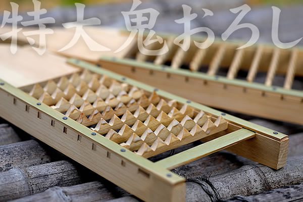 そんな鬼おろしの特大サイズは、やはりその歯も大迫力。孟宗竹を極太に取った鬼歯部分は先端になるに従って幅も薄く加工されてるので、より丈夫によりスムーズに大根おろしをする事ができます。