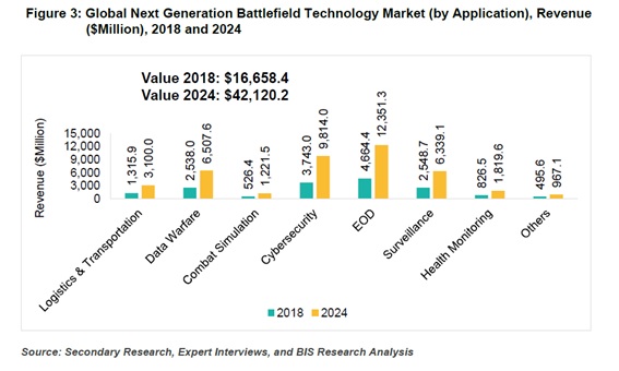 次世代戦場技術の世界市場は、2018年の166億5840万米ドルから2024年には421億2020万米ドルに成長すると予想されています。そのアプリケーションとしては、サイバーセキュリティ、データ戦、監視、物流・輸送、爆発物処理、ヘルスモニタリング、戦闘シミュレーションが挙げられます。