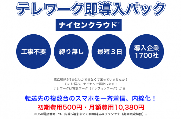 ナイセンクラウド、テレワーク即導入パックの販売を開始。転送先の複数台のスマホを一斉着信、内線化。電話入替えを必要せず最短3日で導入。