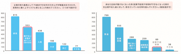 長期的に働く場合に感じる今後のリスクとして、最も多くの票を集めたものは「病気」、次点は働けない状態が続く「就業不能状態」でした。人生100年、70歳定年の時代を生きていく労働者の不安材料が明らかになりました。
