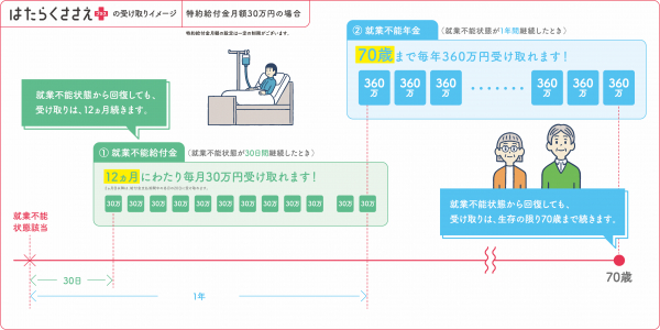 (1)入院または在宅療養による所定の就業不能状態(精神疾患による場合は入院のみ)が30日間継続したとき、給付金を12カ月にわたり毎月お支払いします。