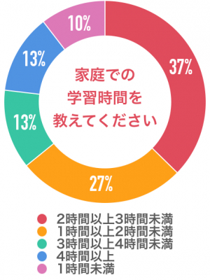 塾のない日の家庭での学習時間を教えていただきました。「2時間以上3時間未満」が37%、「1時間以上2時間未満」が27%、「3時間以上4時間未満」と「4時間以上」が13%、「1時間未満」が10%とのことでした。