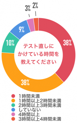 テスト直しにかけている時間を尋ねたところ、「1時間未満」と「1時間以上2時間未満」が38%、「2時間以上3時間未満」が10%、「していない」が9%と続きました。