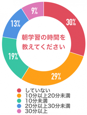 朝学習の時間はという質問では、「していない」が30%、「10分以上20分未満」が29%、「10分未満」が19%、「20分以上30分未満」が13%、「30分以上」が9%と回答をいただきました。
