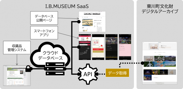 システムの機能の一部として実装されている情報公開機能とは別に、データベース内の管理データをそのままシステム外での発信用データへと応用することを可能にした≪I.B.MUSEUM SaaS≫のWeb-API公開機能は、2019年12月に実装された新機能です。『東川町デジタルアーカイブ』は、これを活用したWebサービスとしては全国初の事例となります。