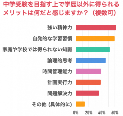 中学受験を目指す上で学歴以外に得られるメリットについて、「強い精神力」と「自発的な学習習慣」が約60%強、「家庭や学校では得られない知識」が50%強と続きました。