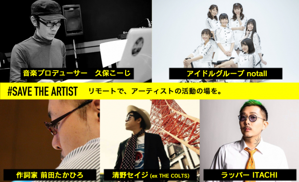 「#SAVE THE ARTIST」では、新型コロナウイルスの影響を受け、活動ができないミュージシャンなどの新たな活動の場、収益源の創出として、SNSやリモートワークを活用し、幅広いクリエイターやアーティストとコラボし、活動で得た収益を分配する取り組みを行ってまいります。