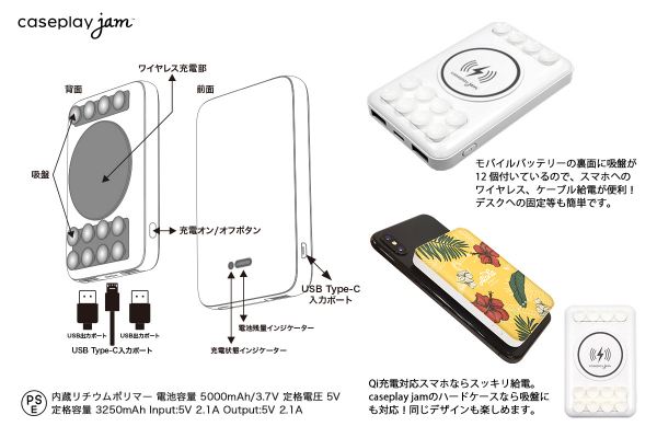caseplay jamから今回発売されたケーブル充電、ワイヤレス充電対応の吸盤付き5,000mAhモバイルバッテリーは、1,000種類以上のデザインから選ぶことが可能です。