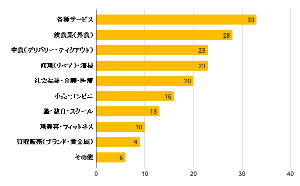 外出自粛や3密回避でサービス業や飲食業は大きく影響をうけていますが、それでも検討者が一番多かったのが【各種サービス】です。次いで【飲食業(外食)】や宅配・テイクアウトの【中食】も根強い人気がありました。