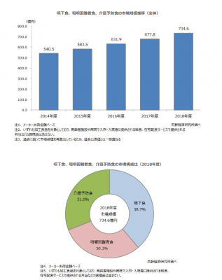 食べる機能の障害、摂食・嚥下障害は誤嚥性肺炎や窒息の危険、脱水や低栄養の危険をもたらすばかりではなく、経口で食物を摂取するという人間の「食べる喜び」を奪うことにつながる。飲み込むことや噛むことが不自由な高齢者や患者を主な対象とした加工食品(嚥下食、咀嚼困難者食)、また、食べる量が少なくなり必要な栄養素が不足する高齢者向け加工食品(介護予防食)の市場規模は拡大しており、2018年度全体市場(メーカー出荷金額ベース)は、前年度比108.4%の734.6億円と推計した。